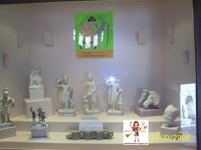 Müzede, Helenistik, Roma ve Bizans devirlerine ait silah kabartmaları, yazıtlar, Eski Yunan orijinallerinin kopyası olan Roma devri heykelleri, torsolar, lahitler, portreler, ostotekler, amforalar, sunaklar, mezar stelleri, sütun başlıkları ve sütun kaideleri sergileniyor. Bizim gittiğimiz 2006 senesinden sonra 2010 senesinde Side Müzesi Müdürlüğü, yaptığı çevre düzenlemeleriyle tarihi eserin teşhir alanını genişletmiş, bu da dip not olsun.